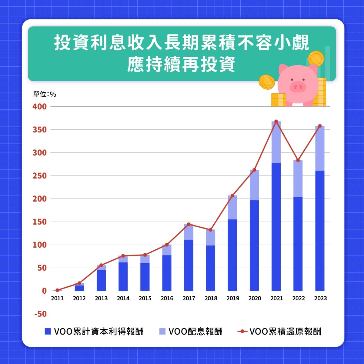 以 Vanguard 標普500 ETF (VOO) 為例,VOO自發行以來每年都有配息,若從 2010 年開始投入至今,可以發現若將每年的配息再投入,有這些配息累積的報酬長期下來同樣不容小覷,由此可知持續進行再投資可以在前期更加快速地累積本金。
