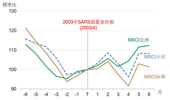 中國政府為因應此次疫情,加大貨幣與財政政策力道,包括年節期間在公開市場上,史無前例的釋出規模1.7兆人民幣的龐大資金,維持金融市場的流動性,並輔以免稅降費等財政措施,使中國股市在充沛資金環境下,短期重挫後迅速反彈。若觀察過去SARS期間,疫情慘重的亞洲股市,當下跌幅較深,但事件平緩後股市反彈幅度最顯。