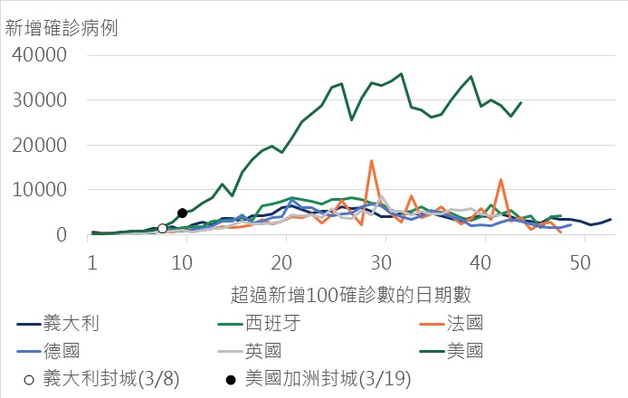 過去幾個月,疫情的發展主導了全球金融市場的震盪,歐美確診人數在3月開始大量爆發,首先是義大利於3月8日封城、接下來是西班牙、法國和德國,英國和美國則在3月22日發布禁足令,幾乎全球70% GDP的地區都在實施嚴格的封鎖和隔離。企業營運受到了阻礙,資金流出現斷鏈危機,加上市場擔心經濟衰退,股市重挫下呈現多殺多局面。所幸,在各大央行大力降息和救市措施之下,金融市場的恐慌情緒下降,公債流動性緊張局面減緩,企業利差從高檔緩降,股市亦從低點反彈。未來景氣的趨勢,以及金融市場是否持續穩定向上,仍取決於歐美疫情的拐點是否來到?