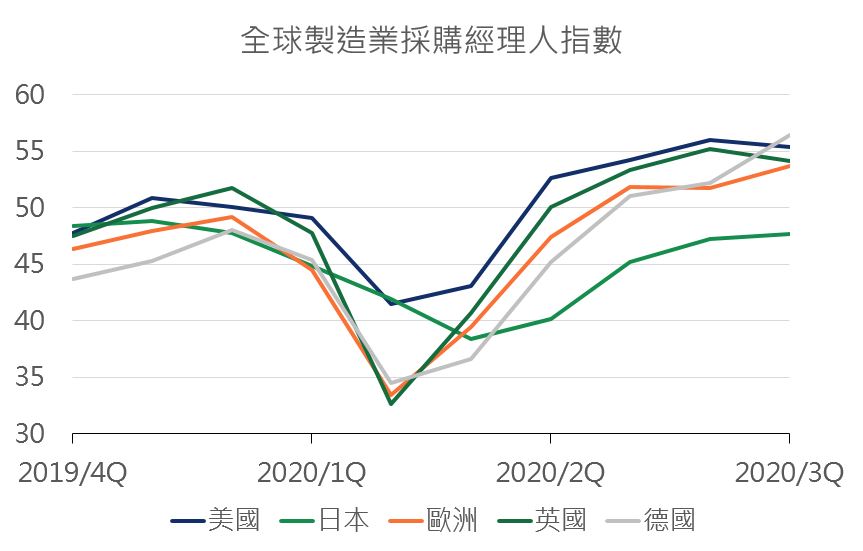 回到全球景氣狀況,主要國家製造業供給、需求回升、製造業回補庫存下,景氣持續改善,儘管服務業受疫情回復速度較慢,部分歐洲國家甚至重啟管制隔離政策而再度轉弱,但觀察製造業指數皆穩步改善,顯示未來需求情形仍將持續好轉。美國選後若短期未能達成新一輪紓困協議,收入下滑可能會使年底經濟數據偏弱,預期新國會最遲明年1月就任後有機會推出紓困政策,經濟不至於出現驟然急墜扭轉趨勢。全球製造業庫存回補告一段落之前,整體景氣復甦腳步預計仍將延續,近期需求改善、部分國家因管制隔離政策而干擾生產活動進度,反而可能讓此波庫存回補時間進一步延長。