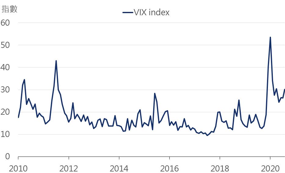 美國大選即將舉行,從賭盤或民調上,目前拜登領先的幅度皆較大,過去一個月諸如替代能源等產業相對突出表現,也顯示市場已部分反映兩位候選人的政見差異。然而,相較過往而言,此次選舉因受疫情影響,有近40%的民眾選擇用郵寄選票,加上逾三成州以大選日作為郵戳寄出的截止日期,此次選舉存在當日計票難以知曉結果的可能情況。觀察10月經理人調查及11月VIX指數,選舉的不確定性,使得市場預期11月波動放大。
