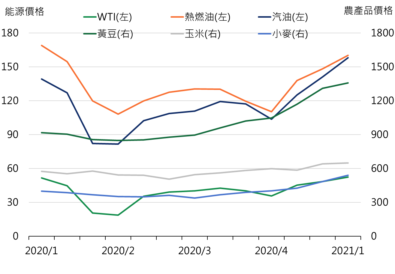 此外,近期亦觀察到除工業外,商品原物料亦因氣候與疫情影響,庫存消耗加速,黃豆、玉米等糧食供給不足,導致價格大漲。