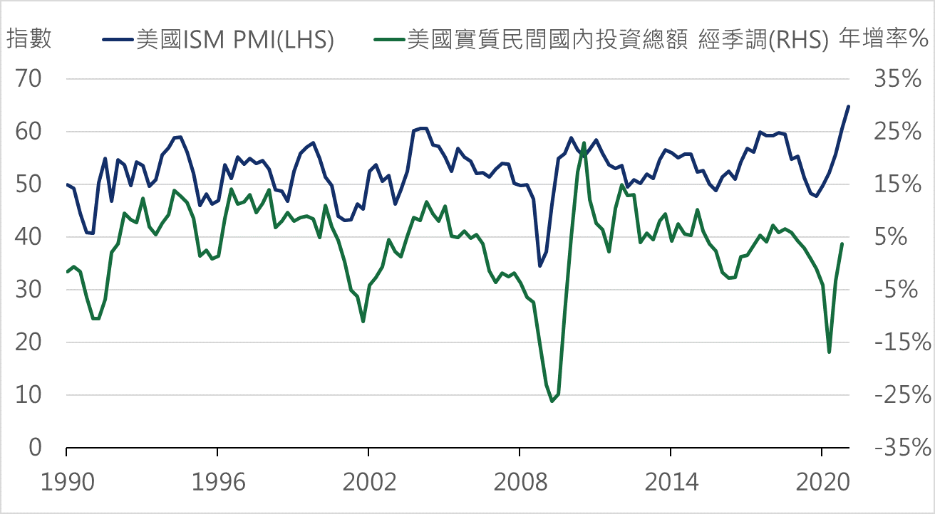 繼去年底9000億美元財政支出後,拜登將再推出2.3兆美元的財政刺激方案,本次支出將以基建投資以及綠能建設為主,旨在增加就業與改善美國基礎建設,財政支出增加將有助於延長景氣復甦時程;另外,因應疫情造成全球製造業供需失衡,供給缺口持續擴大,大多企業多在今年增加資本支出,半導體龍頭公司台積電宣布將今年資本支出從年初的250~280億美元,調高至300億美元,主要因應未來市場需求大幅成長,將帶動相關供應鏈的獲利與營收成長,預期全球科技產業今年持續增加資本支出,獲利將隨著全球景氣復甦回升,支撐股價成長。