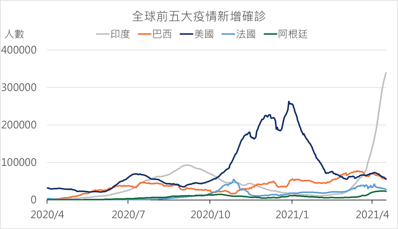 至4月底英、美兩國疫苗施打率超過60%,新增確診人數明顯回落,其他歐洲國家4月底疫苗施打率接近20%,目前新增確診人數自高檔回落,但在英國成效明顯下,歐洲各國將以加速疫苗施打率為首要目標;反觀已開發國家中,日本疫苗施打率偏低,至4月底疫苗施打率不及5%,明顯落後於其他已開發國家,導致近期每日新增確診人數再度攀升,日本在三度宣布東京、大阪等地區實施緊急狀態,再次封城,造成日股走弱;另外,新興市場如巴西與印度,疫情再次惡化,新增確診人數持續攀升,顯示新興市場在疫苗取得弱勢下,疫情控制相對不如已開發國家,進而衝擊今年經濟復甦力道。