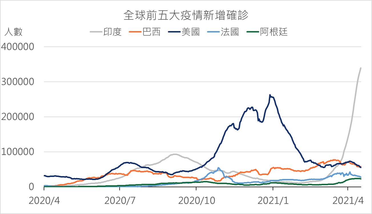 隨美國、歐洲地區疫苗施打率持續提升,成熟市場新增感染人數已處於逐步遞減的狀態,經濟活動也逐步恢復常態,與此同時新興市場部分國家如印度、巴西、智利及東南亞多國仍飽受在感染人數基礎較高下,疫情更加擴散及缺乏疫苗的狀態。