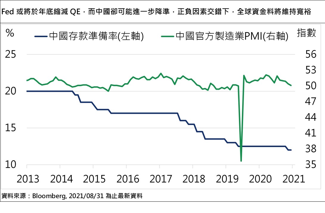 美國聯準會主席表示,如果經濟發展大致符合預期,那麼今年開始縮減美聯儲每月1,200億美元的資產購買規模可能是合適的,因此近月的美國經濟將是觀察重點,包括就業市場與物價變化;但是在中國今年第二季開始面臨水患與疫情干擾,經濟增長明顯降溫,7月中國人行已調降一次存準率,預期第四季還有再次調降的可能,用以抵銷美國購債規模縮減的影響,因此全球資金狀況仍維持相對寬鬆。