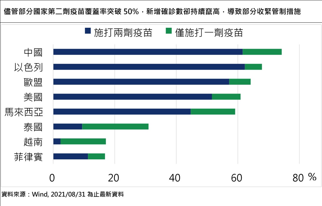 全球疫情升溫,已開發國家加速疫苗施打,歐美主要國家第二劑施打率均已超過50%,但是已完成疫苗第一劑施打率超過80%的以色列,近期每日確診人數再創新高,使得以色列開始收緊管控措施,壓抑服務業進一步復甦;歐洲各國亦紛紛實施疫苗護照,也一定程度限制了經濟活動再進一步復甦。