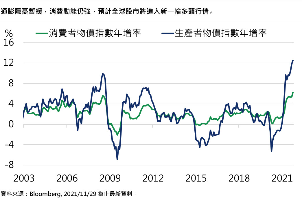 近期美國多數企業財報仍優於預期,觀察近期消費數據,美國第四季消費動能仍強,旺季未如市場擔心的旺季不旺。全年美股企業獲利維持高速增長,在通膨隱憂暫緩下,美股由科技成長股帶動的一波股市估值回升,將使股市加速上漲創新高,未來將帶動全球股市進入新一輪多頭行情。