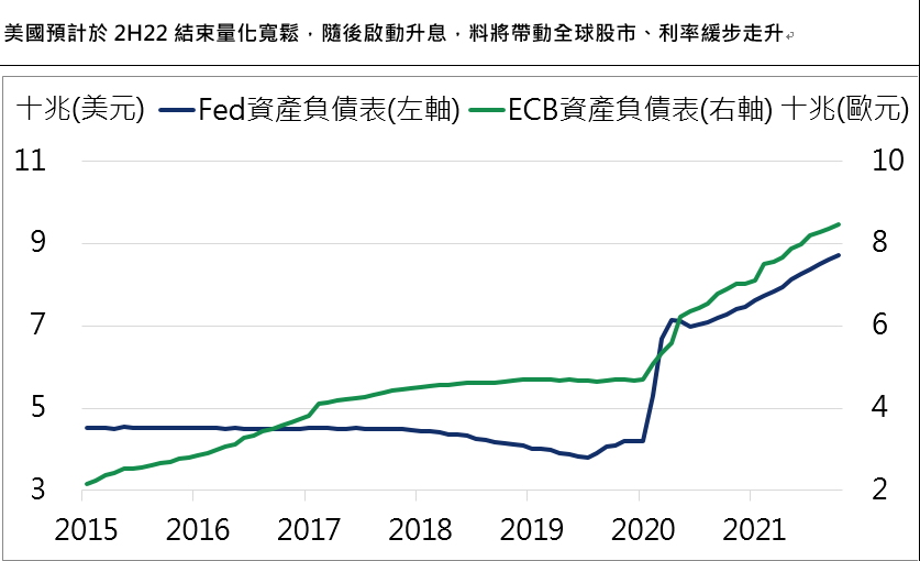 2022年美國將在上半年結束量化寬鬆政策,同時啟動升息;過往量化寬鬆貨幣政策的目的是避免流動性風險,造成金融危機,目前美國是資金寬鬆、利率維持低檔,並無流動性風險問題,因此聯準會在2021年底開始縮減量化寬鬆政策規模,2022年上半年結束量化寬鬆政策;另一方面,2020年在全球大規模財政與貨幣政策支持下經濟很快自衰退回升步入擴張態勢,強勁的需求推升物價走揚,通膨壓力加大,迫使各國紛紛升息對抗通膨,2021年以來許多新興市場國家連續性升息抑制通膨,已開發國家中英國已啟動升息,資金大幅寬鬆的時間已過,利率將呈現大區間格局。