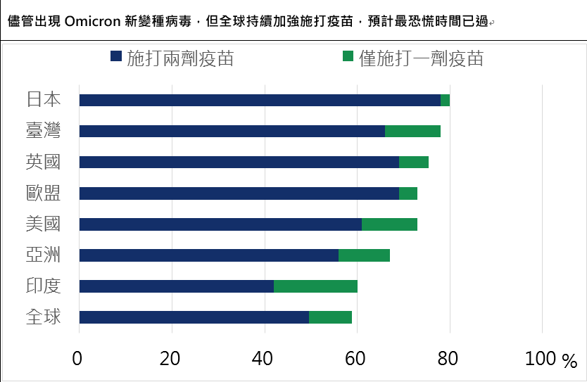 2022年全球經濟步入後疫情的復甦之路,但在經濟增長的高基期下,全球經濟增速放緩,但是仍維持擴張的態勢;經過2年全球疫情反覆仍未平息,但相較2020年初目前狀況大幅改善,主要是各國疫苗持續施打,歐美疫苗覆蓋率大多超過六成、新興市場亦有五成覆蓋率,因此變種病毒的致死率降低,惟傳染性持續,一定程度干擾景氣復甦的速度與幅度,但是最恐慌的時間已經過去,全球經濟仍緩步復甦。
