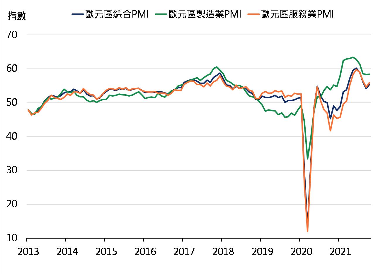 整體而言,2021年11月全球製造業PMI指數由前月54.3小幅回落至54.2,製造業景氣持續維持擴張,發達國家普遍回升,過去幾個月表現較弱之歐洲止跌回穩,發揮穩定力量;主要拖累為新興市場國家,中國在供電危機緩解後重回復甦軌道,但巴西在鐵礦砂價格大幅回落下,製造業轉為緊縮,顯示全球製造業景氣受疫情反覆及供應鏈受限影響而有所分歧。以下我們逐一檢視主要經濟體經濟現況: