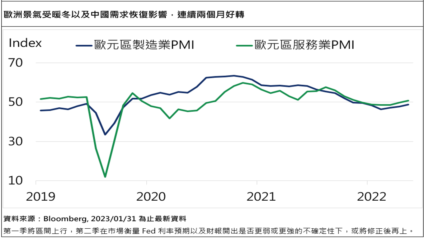 中國疫情並沒有出現第二次高峰,發熱門診就診量持續減少。春節消費數據表現出現結構性改善,旅遊與電影行業恢復迅速,整體回到疫情前的80%左右,地產以及汽車銷售仍較疲弱,消費領域呈現商品消費弱,服務消費強的狀況,後續觀察可選消費領域如餐飲、家電等板塊;市場期待全年仍以消費與地產的邊際恢復為全年的經濟動能,元宵節後的復工力度為短期觀察重點。 歐元區1月PMI為50.2(前值49.8),為7個月以來首次回歸榮枯線上,此外ZEW經濟預期指數亦飆升至16.7%(前值-23.6%)由負翻正,主要受到美國工資降溫、歐洲暖冬、德國工業回溫、中國解封鎖所激勵。