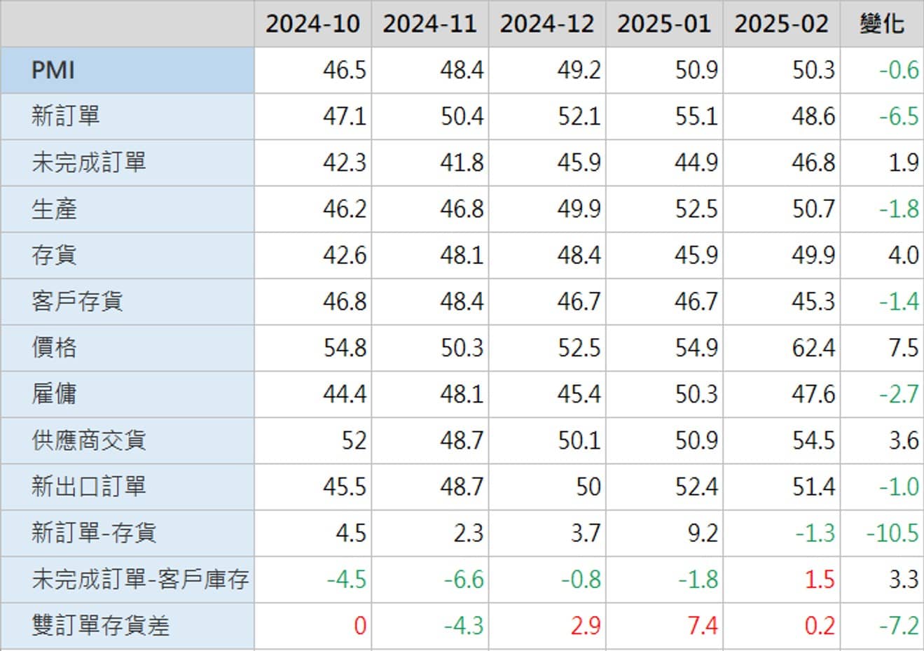 全球製造業自在2021/5~2022年多數時間受庫存調整、需求減弱趨勢放緩,2023年初起逐漸回升,但回升過程較為波折。惟2024/9月以來隨Fed展開降息循環及中國加大刺激景氣,預計將帶動需求及信心回暖。然而自2024/11月川普上任後,關稅不確定性促使企業進行提前拉貨,2025第一季因提前拉貨透支效應帶動景氣成長動能趨緩,預估關稅不確定性落地後,景氣將恢復成長動能。
