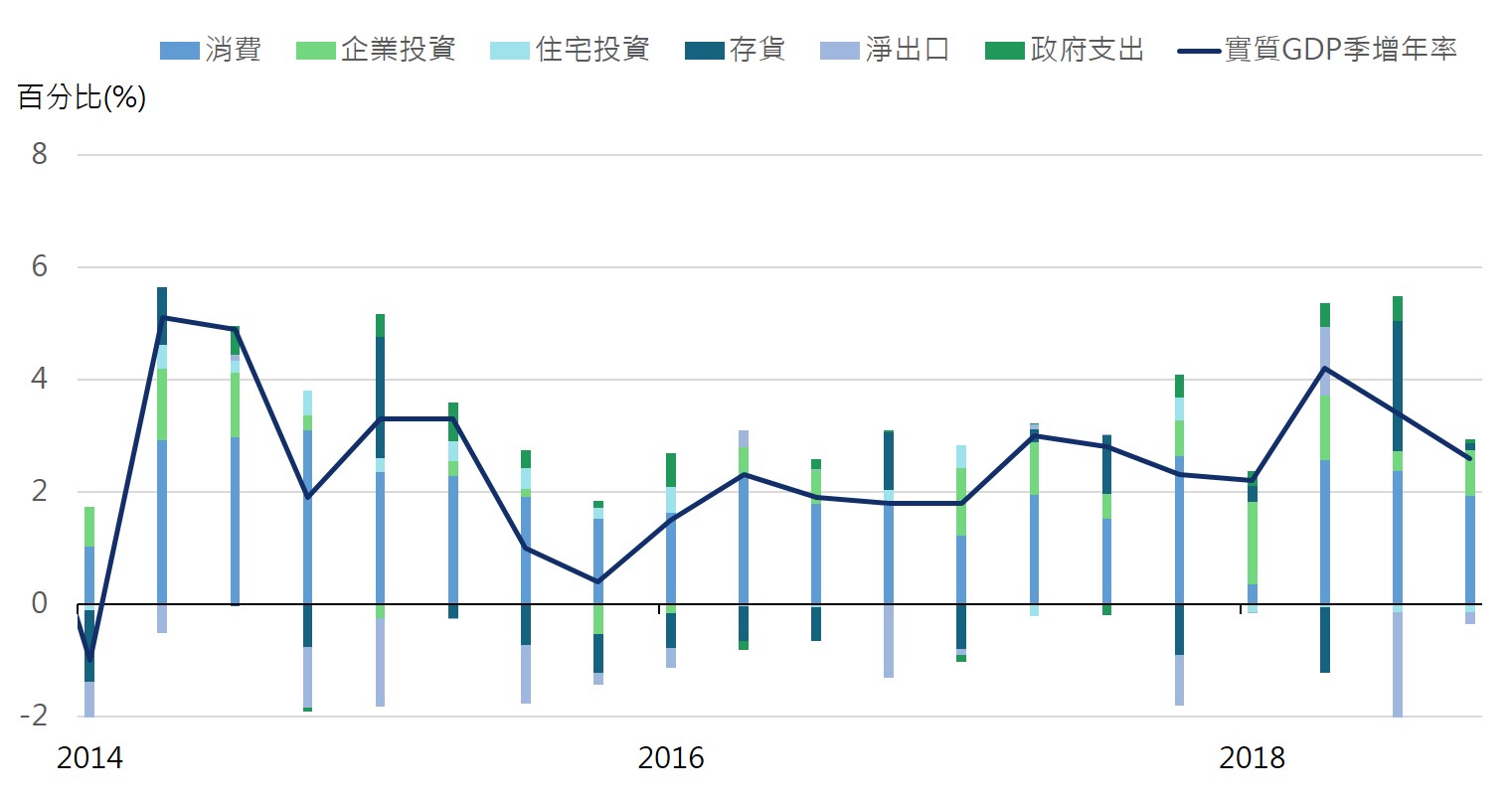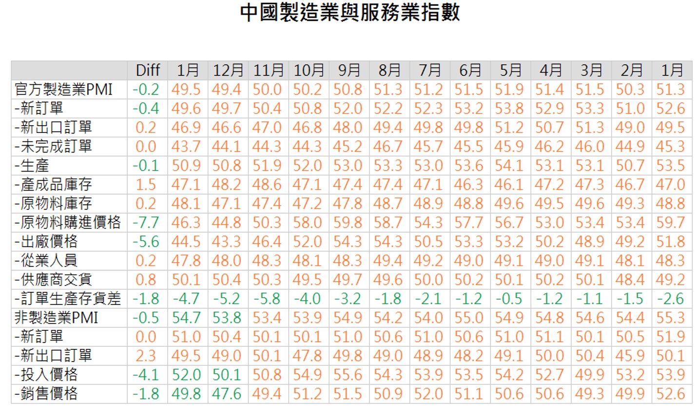 中國2月製造業PMI由49.5降至49.2;非製造業PMI由54.7降至54.3;綜合PMI由53.2降至52.4。2月受春節影響,生產指數及製造業PMI季節性走低,降幅少於過往,扣除春節因素PMI應連續兩個月回升。主要分項中,新出口訂單下降顯示全球景氣仍在放緩,但新訂單及隱含內需新訂單顯著回升,反映內需改善;訂單生產存貨差負值顯著收斂且原物料、產成品庫存續降至中性偏低水位,顯示2H18企業降價去庫存壓力稍緩。整體而言,中國製造業景氣仍偏弱,但內需趨穩、降價去庫存壓力緩和。與此同時,中國釋出寬鬆貨幣政策及擴大減稅措施,提供底部支撐。