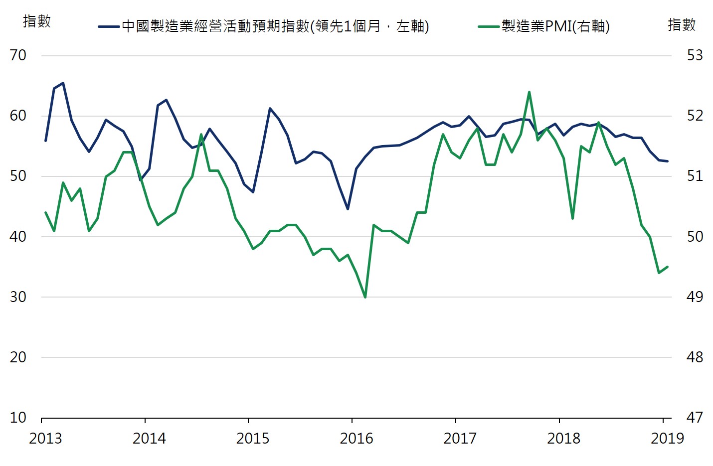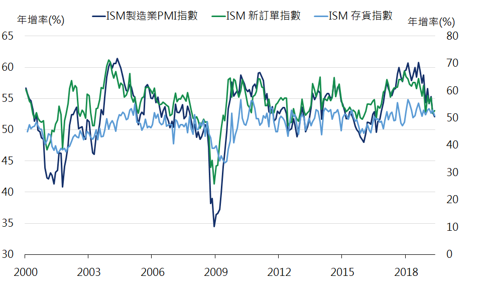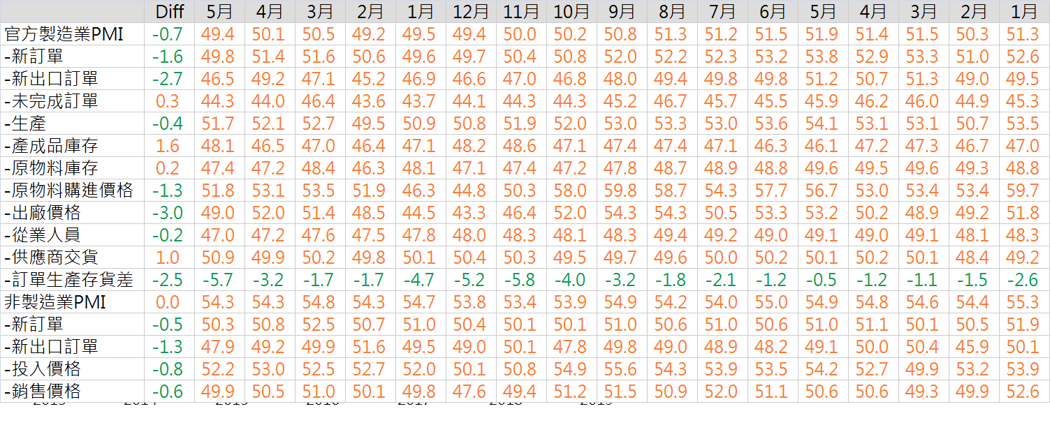 中國5月製造業PMI由50.1降至49.4;非製造業PMI持平於54.3;綜合PMI由53.4降至53.3。在1~3月偏旺、4月降溫後,中國5月PMI回落且顯著不及過往pattern(5月為淡季,過往5月製造業、非製造業PMI分別平均下降0.5、回升0.1),需求走弱為主因。主要分項中,新訂單及新出口訂單皆大幅回落,內外需轉差;產成品庫存年初改善後5月增至偏高水準、訂單生產存貨差趨勢改善現象中止(單月由-3.2降至-5.7,接近2018/11之-5.8)、 出廠價格回落;製造業及非製造業就業人員下降。