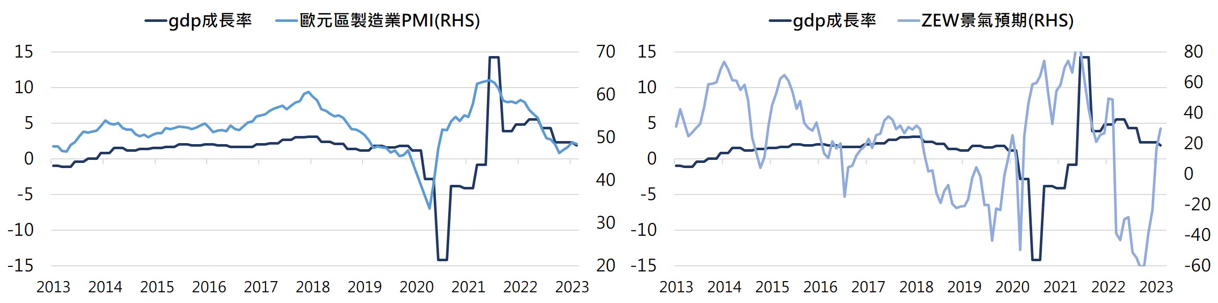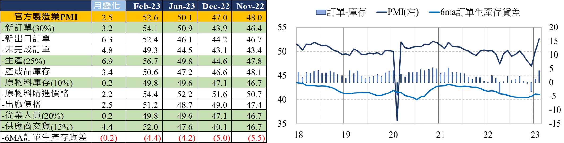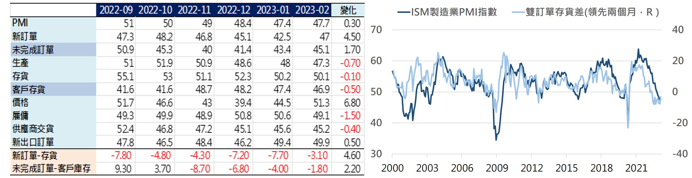 全球製造業自2021/5放緩以來,2023年2月見到第二個月的小幅改善,鑒於此輪下行時間已略長於1999年以來的平均下降月數17個月,並接近過往下行周期最長的22個月(2013/11~2015/9)、23個月(1999/11~2001/10)、27個月(2007/10~2009/12),中國及歐洲都已開始改善,美國仍在放緩但具領先性的雙訂單存貨差、區域Fed 6個月後展望都開始改善,符合製造業庫存下行週期進入尾聲樣貌,加上目前就業市場保持穩健且高職缺率將避免失業率大幅攀升,因此隨庫存調整進入尾聲及家計購買力仍在,預計景氣接近此輪下行尾聲,將在1Q築底後逐漸回升改善。