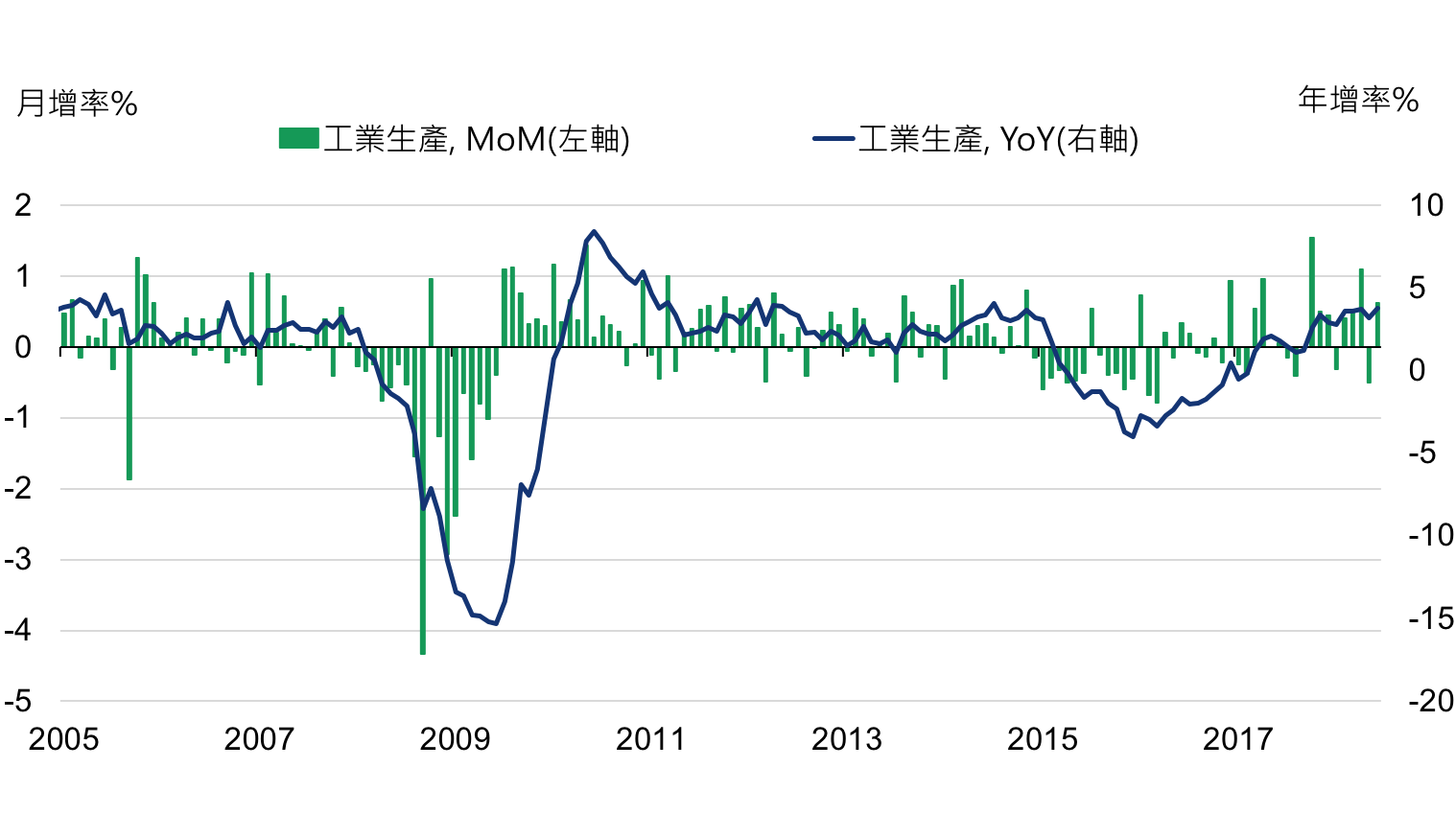 2018年6月全球製造業PMI指數自前月53.1微幅下滑至53.0,仍在50以上的擴張區間,主要國家歐元區及中國微幅下滑,其餘包括美國、英國、及日本則呈現改善,其中美國連續2個月上升,且再度站上60以上的強勁擴張區間,美國工業生產Q2季增率回揚,顯示美國工業部門穩健成長趨勢未變,成長力道仍相對強勁。