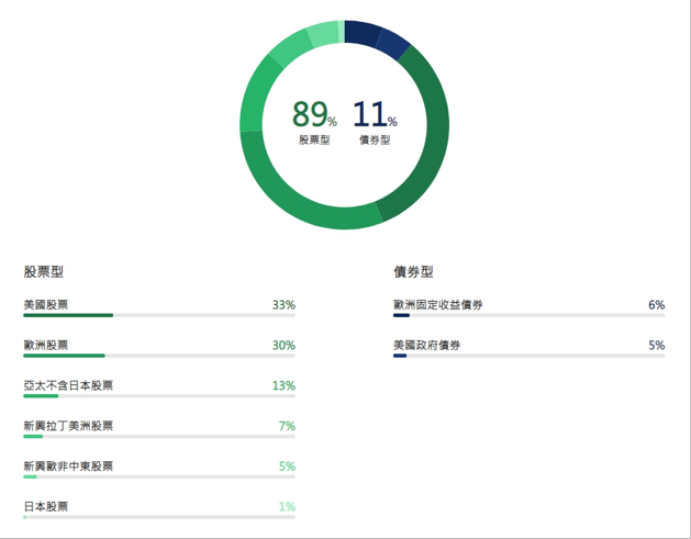 設定完風險承受度後就來到最後的尾聲啦,這邊智能投資組合建議的股債配比為89% : 11% (果然夠積極),再分別將股債的投資區域與類型一一列出。