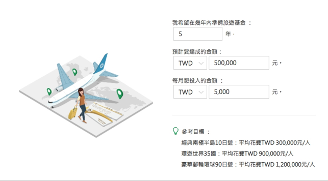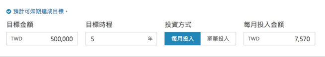 選擇好環遊世界後接下來就填上預計要達成的年限以及到時需要的資金是多少,小黑這邊就來選個5年、每月定期定額$5,000,然後希望5年後變成$500,000 (統治地球只要50萬?)