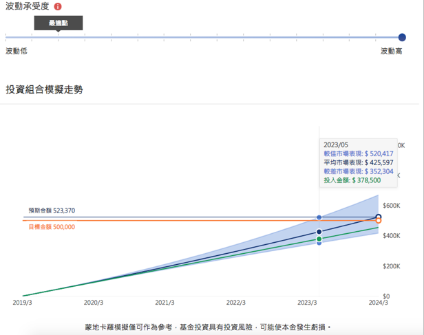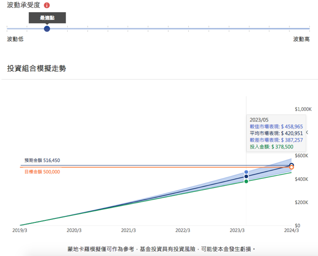 不過像小黑我這種風險愛好者當然是將風險承受度調到最高(最低到最高共有15個等級),調高後可以看到未來的情境模擬投射擴大了!相比原本的波動承受度最適點,到期時的平均值沒有差太多,但是較佳情境金額變得更高、較差情境到期金額變得更少~