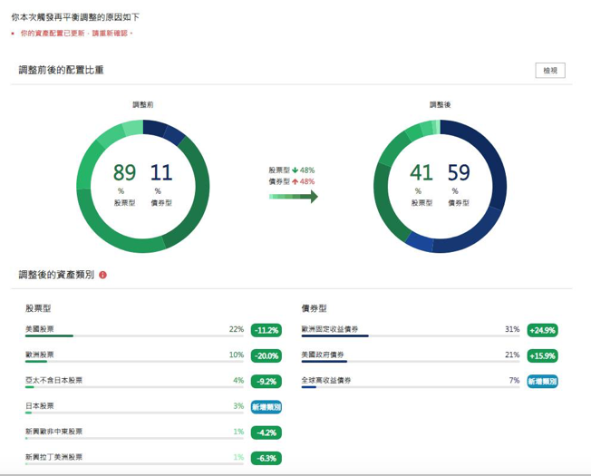 調低波動後系統建議將債券比重從原本的11%提高到59%,股票部分則是從89%降低至41%,並且減持了新興市場股票、增持成熟市場股票,以達到降低投資組合波動的目的。