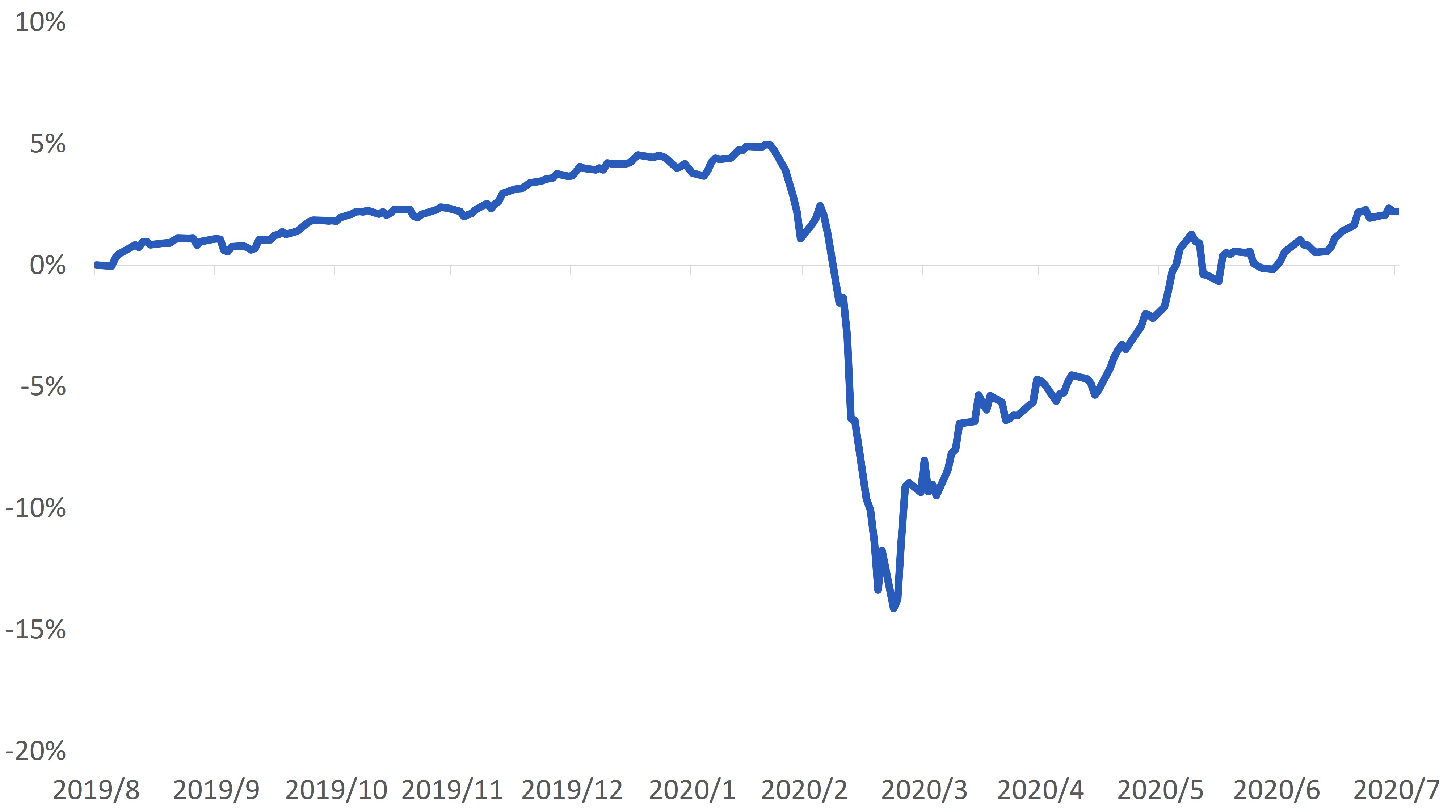 公司債表現優於政府債:七月份債券持續創造正報酬,因風險情緒提高,高收益債券績效當月表現最佳,而聯準會執行其公司債券購買計劃,公司債表現優於政府債。在疫情不確定性仍在,央行則保持極度寬鬆的貨幣條件下,固定收益標的如債券仍有可為。