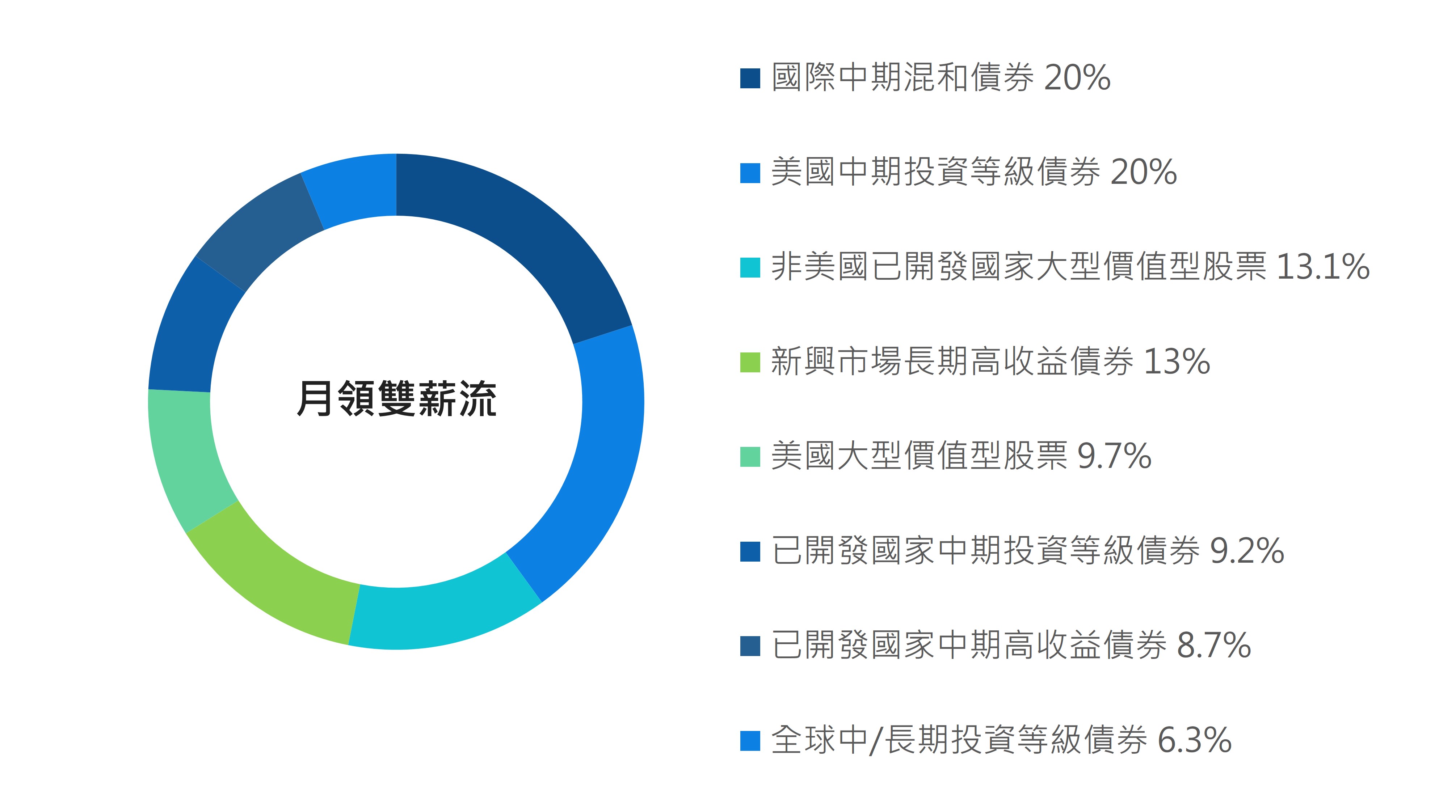 多元布局減緩波動:藉由分散布局,保護投資人避免因市場系統性風險而蒙受損失。「月領雙薪流」具備月配息特性,除分散投資標的外,並提供穩定收益,有助降低整體波動度,在市場震盪期間更具優勢。